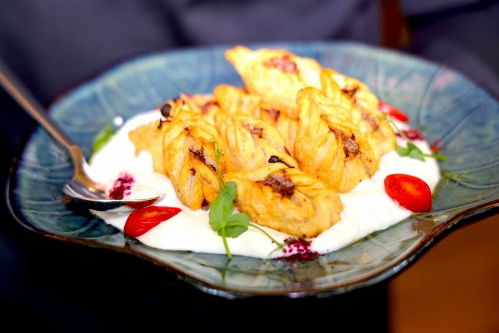 Frau Rena Rafiyeva sagte: „Bitte probieren Sie unbedingt Gurza. Das ist ein traditionelles Gericht meines Heimatlandes. Es besteht aus Teigtaschen, die mit Hackfleisch gefüllt sind. Meist ist es Lammfleisch, selten Rindfleisch. Zwiebeln, Pfeffer, Salz sind entweder schon in der Teigtasche oder eine mit diesen Zutaten bestehende Brühe wird serviert. Jede Region Aserbaidschans kennt die ganz speziellen Zutaten, die es nur in dieser Region gibt. So gibt es Regionen, wo bestimmte Kräuter unbedingt zur Gurza gehören, in anderen Gebieten ist es ein Hüttenkäse. Beim Kochen gibt es auch Unterschiede in den einzelnen Regionen. Mal wird die fertige Gurza in kochendes Wasser gelegt, anderswo in der Pfanne mit Öl gebraten. Zur Gurza serviert man neben der schon erwähnten Brühe auch Joghurt, Knoblauch oder eine saure Pflaumenpaste“.