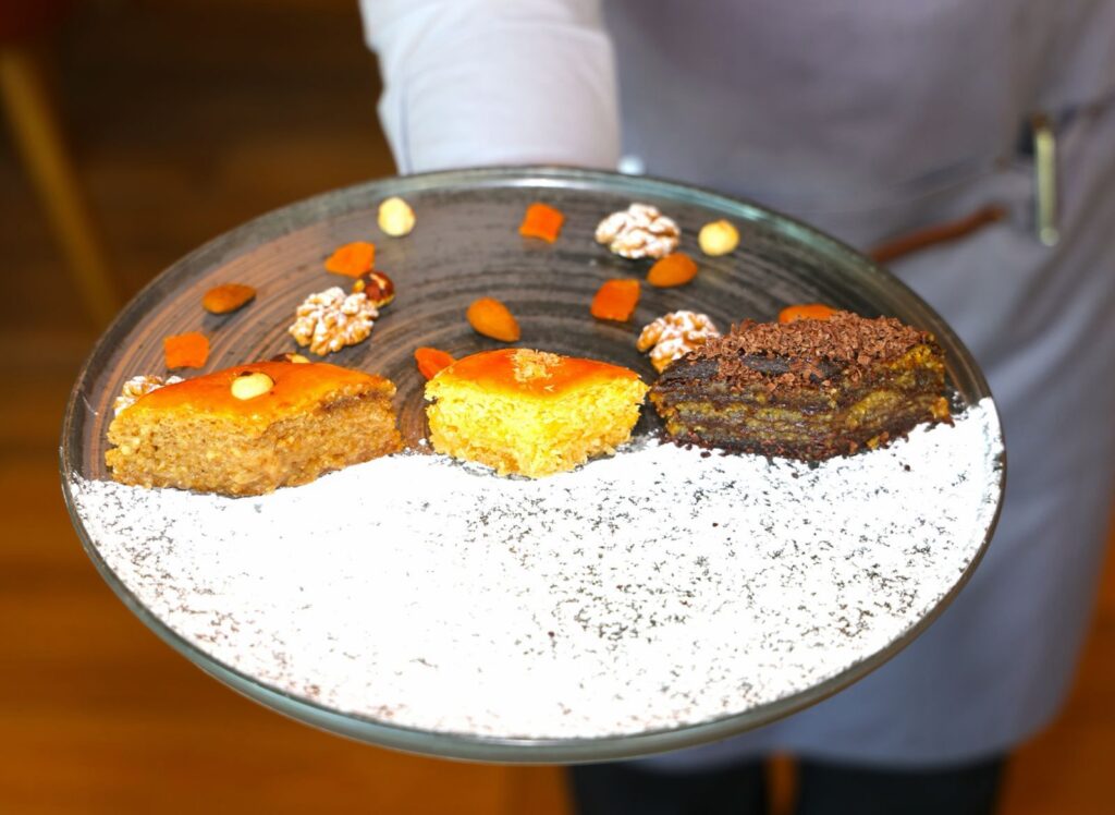 Als Dessert empfiehlt sich ein gutes Kännchen Tee und dazu Baklava. Das Gebäck Baklava stammt aus Vorderasien. Man füllt es mit Pistazien oder gehackten Walnüssen und Mandeln.