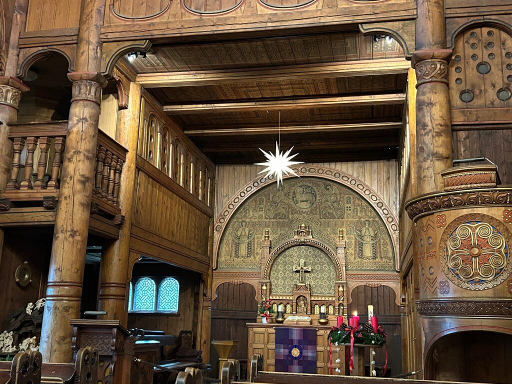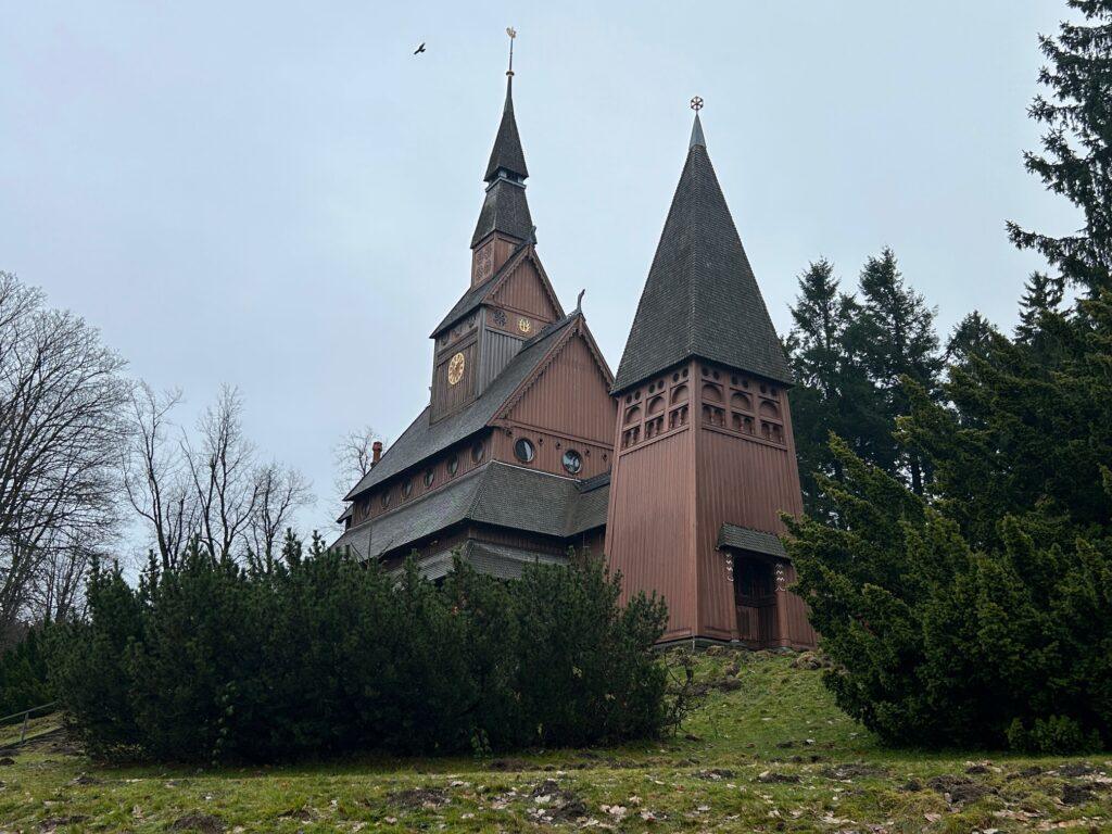 Ein besonderes Wahrzeichen des Ortes ist die weithin bekannte Stabkirche Hahnenklee, die sich direkt gegenüber dem Hotel befindet und sich malerisch in die Landschaft einfügt. Das 1908 eingeweihte Gotteshaus wurde im norwegischen Stil errichtet und zählt zu den architektonischen Besonderheiten im Harz. Mit ihren dunklen Holzelementen, kunstvollen Schnitzereien und der markanten Dachkonstruktion erinnert die Kirche bewusst an skandinavische Vorbilder und ist heute ein beliebtes Fotomotiv sowie kultureller Anziehungspunkt für Besucher.